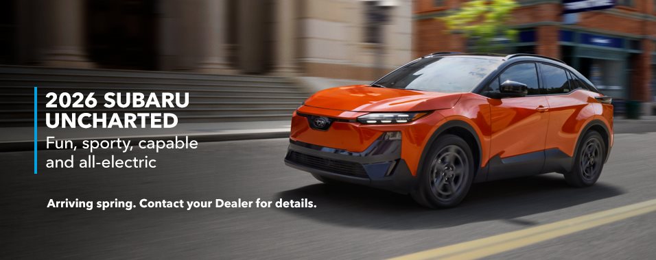 Meet the all-new 2026 Subaru Uncharted, the all-electric SUV that’s as comfortable navigating city streets as it is chasing the weekend. Compact and athletic, it feels light on its feet in traffic, composed on the highway and confident when conditions change. With an all-electric estimated range of up to 496 km1, 3, daily routines stay easy, while DC fast charging can restore 10–80% from 30 minutes² in ideal conditions. For drivers who desire more punch, the available dual eAxel powertrain delivers 338 hp and available Symmetrical Full-Time AWD. These are backed by available dual-function X-MODE® and 208 mm of ground clearance for added confidence off the pavement. Inside, a refined, modern cabin centres around a 14-inch touchscreen, dual wireless phone chargers and SubaruConnect™ connectivity. It’s electric driving that feels natural, fun and unmistakably Subaru.